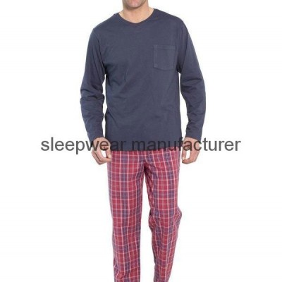 mens pajamas set:top knitted jersey,pants:yarn dyed flannel 21x21/64x54